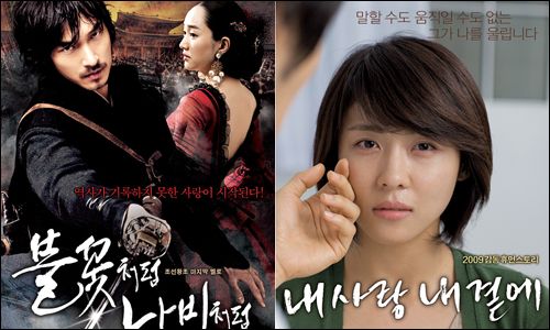 [아시아경제신문 황용희 연예패트롤] '서사멜로' VS '감동휴먼 멜로'오는 추석 극장가를 수놓을 두 편의 한국 영화 장르다.여인이고픈 명성황후를 조명한 '불꽃처럼 나비처럼'과 김명민· 하지원의 애절한 연기가 화제가 되고 있는 '내사랑 내곁에' 등은 모두 올 가을 추석 극장가를 석권할 것으로 기대되는 한국 영화들이다.이들은 모두 멜로라고 하기엔 너무나 크고 감동적이다. 영화제작사나 홍보사는 당연히 이 부문을 일반에 알리고 싶어 한다.#'불꽃처럼 나비처럼'에는 95억원 제작비가 투자된 서사멜로극. '불꽃처럼 나비처럼'을 이끌고 있는 배우는 수애와 조승우다. 뛰어난 연기력을 바탕으로 한 이들은 수애의 카리스마와 조승우의 절제미가 어우러져 올 가을 최고의 '멜로카드'로 부각돼 왔다.'모두가 알지만 아무도 몰랐던 명성황후 '민자영'과 모든 것을 바쳐 그녀를 지킨 호위무사 '무명'의 가슴 시린 사랑'이란 부제를 단 영화 '불꽃처럼 나비처럼'은 멜로라는 단어 앞에 '서사'라는 수식어를 하나 더 달았다.이유는 간단하다.멜로는 이미지가 너무 작고, 식상해 보이기 때문이다. 멜로장르는 그저 사랑하는 두 연인이 아기자기한 사랑을 하다 아픔을 안고, 헤어지거나 혹은 해피엔딩으로 끝난다. 이 과정이 너무나 통속적이고 뻔해 보여 보기에 따라 매우 작아 보인다.하지만 '불꽃처럼 나비처럼'은 무려 95억원의 제작비가 들어갔다. '해운대'에는 못미치지만 웅장한 스케일이나 화려한 의상, 그리고 1:10,000의 광화문 전투 장면 등은 '불꽃처럼 나비처럼'이 내세우는 최고의 장면들이다. 조승우가 연기한 무명이 CG에 의해 새롭게 부활한 광화문 광장에서 수천 명의 군사들과 홀로 맞설 때는 할리우드 불럭버스터 못지않은 장엄함이 보는 이의 마음을 시원하게 만든다.따라서 명성황후 '민자영'과 호위무사 '무명'과의 아련한 멜로는 그저 이 영화의 소재일 따름이다. 그런데 멜로만이 전면에 부각되니 제작자의 입장에선 안타까울수 밖에…. 명성황후 '민자영'을 위해 검을 드는 '무명'은 이번 영화 속에서 특별히 만들어진 인물이다. 여인 '민자영'과 강인한 사랑을 보여주는 '무명'은 수애와 조승우가 빼어난 연기로 생명력을 얻게 됐지만 그 보다는 이들이 풀어가는 다양한 연기력이 압권이다.또 서사적인 구조까지 갖고 있다.명성황후와 대원권은 정치적 성향이 달랐지, '권력암투의 산물'이 아니었다는 것을 새삼 이 영화는 지적한다. 그래서 명성황후는 개혁과 열린 정치를 주창했으며, 대원군은 보수를 대표하는 인물로 그려졌다. 또 고종은 무척 똑똑했고, 고품격 문화를 즐겼음을 암시한다. 고종 역시 명성황후의 '열린 마인드'를 좋아했다. 이렇듯 다양한 스토리 구조를 안고 있는 '불꽃 나비'를 그저 멜로로만 치우치기에는 너무나 아쉬움이 많다.#'내사랑 내곁에'에는 인간적인 감동이 있다.'순수멜로'를 거부하기는 하지원 김명민의 '내사랑 내곁에' 역시 마찬가지다.이 영화의 홍보팀 역시 '단순한 멜로'가 아닌 '감동휴먼 멜로'임을 강조하고 있다.영화사측은 초기 홍보 때 30㎏이나 감량한 김명민에게 초첨을 맞췄다. 뼈만 앙상히 남은 그의 모습을 본 많은 팬들은 그의 연기 투혼에 박수를 보냈다.이후 영화에 대한 관심은 '1천만 히로인' 하지원의 뛰어난 연기력에 맞춰졌다. 의식과 감각은 그대로인 채 점점 마비돼가는 루게릭 병과 눈물겨운 사투를 벌이는 남자 종우(김명민 분)와 그의 곁을 지키는 여자 지수(하지원 분)의 감동적인 휴먼 연기가 주요 이슈가 된 것.하지원의 눈물도 큰 관심이 됐다. 과연 '너는 내 운명'으로 한국 최고의 '엘리지 여왕'이 된 전도연의 눈물을 따라잡을 수 있을지도 큰 관심사였던 것.그러기위해서는 그냥 '찌질한 멜로'보다는 감동과 웃음이 함께하는 '감동 휴먼'에 초점이 맞춰야 했다. 최근 '대박'을 낸 '해운대'와 '국가대표' '거북이 달린다' 등에 모두 '감동코드'가 들어 있음이 이들의 발걸음을 가볍게 했다. 따라서 이 영화는 하지원과 김명민이 감동을 책임치고 임하룡 남능미 김광규 등 중견 연기자군이 웃음을 책임지는 구조로 돼 있다. 하지원은 또한 기자인터뷰에서 "이번 영화를 찍으면서 개인적으로 무언가를 많이 얻었다는 생각을 했다. 루게릭 환자 역을 연기하는 김명민의 모습을 보는 것만으로도 너무 가슴이 아파 눈물이 나곤했다. 너무 힘들어하는 김명민을 위해 촬영이 없을 때도 옆에 있어줬다"며 극한 감동의 한자락을 살짝 보여줬다. 이와함께 '너는 내 운명' '그놈 목소리'등을 연출한 박진표 감독에 대한 기대감도 '내사랑 내곁에'가 그냥 '멜로'로만 그치지 않을 것이라는 확신을 줬다.따라서 이번 추석 한국 영화는 멜로를 밑바탕에 깔고 흥행코드랄 수 있는 '감동'과 '액숀' '대서사'를 기둥과 석가래, 지붕으로 삼고 있는 것이다. 과연 '서사멜로'와 '휴먼감동멜로', 누가 더 셀지는 이번 달 24일에야 확인할 수 있을 것 같다.