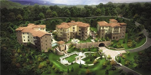 135만㎡ 상당의 골프장 안에 이탈리아 토스카나 지방의 고풍스런 집들이 만들어 지고 있다.강남에서 40분. 이곳 경기도 용인 기흥 코리아C.C에 들어서기까지 걸린 시간이다. 맑은 하늘과 페어웨이, 정원, 부아산의 전경 등 녹지로 확 트인 시야는 쉼과 여유를 가져다 준다. 쌍용건설이 시공하고 글로벌 디벨로퍼 맥밀린 사(McMillin Group)가 시행하는 '투스카니힐스' 골프빌리지는 모두 91개실 규모로 이뤄져 있었다.골프빌리지 입구에서 처음으로 만나는 단지는 타운하우스형 28가구. 좀더 들어가면 듀플렉스형 45가구와 싱글형 18가구가 호수와 페어웨이를 끼고 펼쳐진다.투스카니힐스 듀플렉스형 29동~31동 시공현장
