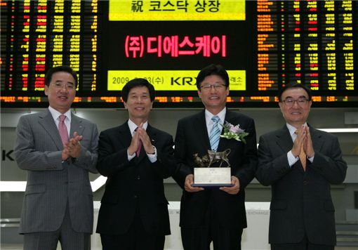 한국거래소(KRX) 코스닥시장본부(본부장 박상조)는 23일 오전 8시40분 서울사옥 종합홍보관에서 LCD모듈 장비를 생산하는 디에스케이의 코스닥시장 신규상장기념식을 개최했다.이솔 기자 pinetree19@asiae.co.kr<ⓒ세계를 보는 창 경제를 보는 눈, 아시아경제(www.asiae.co.kr) 무단전재 배포금지>