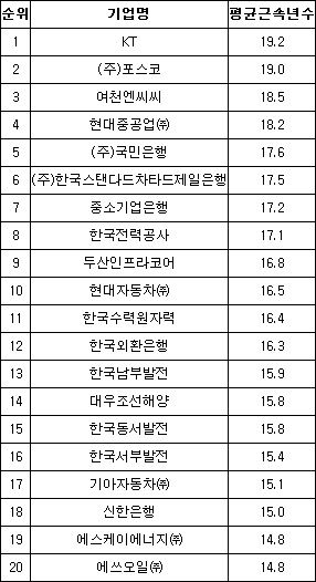 국내 매출액 100대 기업의 직원 평균 근속연수는 11.4년 정도인 것으로 나타났다. 지난해(10.8년)보다 0.6년이 늘어난 수치다.취업포털 잡코리아(www.jobkorea.co.kr)가 금융감독원에 2009년 반기보고서를 제출한 국내 매출액 상위 100대 기업 중 85개 기업을 대상으로 직원 현황을 분석한 결과이다.전체 직원의 평균 근속연수가 가장 높은 기업은 KT(19.2년)로 지난해(19.4년)에 이어 1위에 올랐다. 다음으로는 포스코가 19년으로 근소한 차이를 보였다. 1인 평균 급여액(반기지급)의 경우 한국스탠다드차타드제일은행이 평균 3700만원으로 가장 높았다. 이어 한국씨티은행 3650만원 금호석유화학 3640만원 한국수력원자력 3556만원이었다.기업에서 지급하는 총 급여액은 삼성전자가 2조3,356억원으로 1위를 차지했다. 이어 현대자동차 1조5689억원 KT 1조37억원 LG전자 9831억원 기아자동차 9042억원 순으로 집계됐다.전체 직원규모(6월 기준)에 있어서는 삼성전자가 8만3558명으로 월등하게 많았으며 현대자동차가 5만 5801명으로 2위를 차지했다. 뒤를 이어 KT 3만6807명 기아자동차 3만2652명 LG전자 2만8577명 순이었다.전체 직원 규모 (직원수) 상위 20위 기업 (단위 : 명)<br />