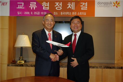 이스타항공 이상직 회장(오른쪽)이 동국대학교 오영교 총장(왼쪽)과 교류 협정 체결식을 갖고 기념사진 촬영을 하고 있다.