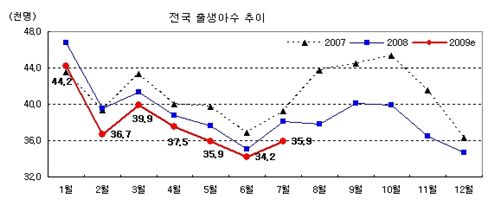 혼인건수는 지난해 9월 전년 동월보다 1800건 증가한 이래로 ▲10월 -1800건 ▲11월 -6600건 ▲12월 -1300건, 그리고 ▲올 1월 -1100건 ▲2월 -1200건 ▲3월 -2600건 ▲4월 -1800건 ▲5월 -2500건 ▲6월 -1300건 등으로 10개월째 계속 줄어들고 있다.출생아수 역시 지난해 2월 전년 동월보다 200명 늘어난 이후 ▲3월 -2000명 ▲4월 -1300명 ▲5월 -2000명 ▲6월 -1800명 ▲7월 -1200명 ▲8월 -5900명 ▲9월 -4500명 ▲10월 -5400명 ▲11월 -5000명 ▲12월 -1600명, 그리고 ▲올 1월 -2600명 ▲2월 -2800명 ▲3월 -1400명 ▲4월 -1300명 ▲5월 -1700명 ▲6월 -800명 등으로 무려 17개월째 감소세를 나타냈다.(자료: 통계청)