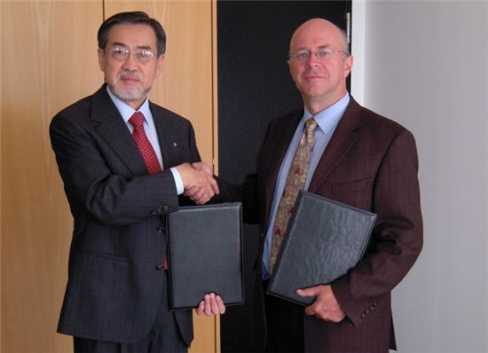 한홍택 KIST 원장(사진 왼쪽)과 안드레아스 만츠 박사가 독일 현지시각으로 28일 KIST 유럽연구소에서 임용계약을 체결하고 악수를 나누고 있다.