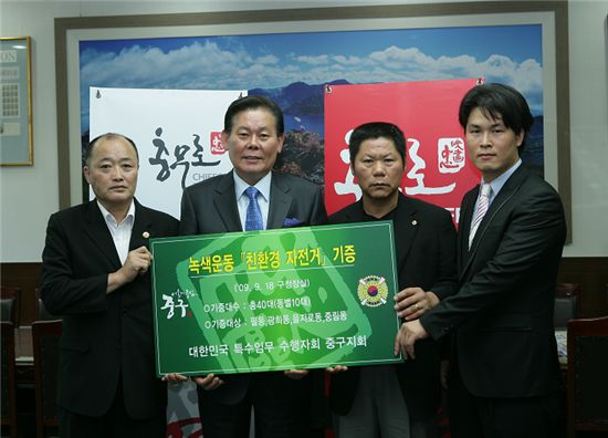 기증된 자전거는 중구내 15개 동주민센터중 12개 동주민센터로 각 10대씩 전달돼 주민이 언제든지 무료로 이용할 수 있도록 했다. 전달되지 못한 3개동 주민센터에 대하여는 자전거를 확보하는 대로 기증할 계획이다. 특히 고장시에는 신고만 하면 무료로 수리 해준다(☎ 2266-8243) 기증 자전거는 자체 회비로 구입하거나 도로변, 아파트단지, 주택가에 고장 등으로 무단방치된 폐자전거를 수거, 수리하는 방법으로 확보하고 있으며 이를 통해 쾌적한 주거환경 조성은 물론 에너지 절약, 자원재활용 분위기 확산에 크게 기여하고 있다. 정동일 중구청장은 “이번에 특수임무 수행자회에서 기증한 자전거는 친환경, 녹색운동의 수범사례”라면서 “앞으로도 많은 주민들이 자전거 이용을 생활화 하고 에너지 절약과 자원재활용에 더욱 많은 관심을 가져줄 것”을 당부했다. 박종일 기자 dream@asiae.co.kr<ⓒ세계를 보는 창 경제를 보는 눈, 아시아경제(www.asiae.co.kr) 무단전재 배포금지>