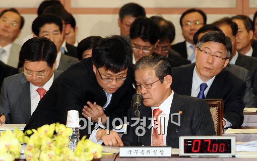 [아시아경제 이재문 기자] 5일 오전 정부중앙청사에서 열린 국회 정무위 국무총리실 국정감사에서 권태신 실장이 정부 관계자와 대화를 나누고 있다.이재문 기자 moon@asiae.co.kr<ⓒ세계를 보는 창 경제를 보는 눈, 아시아경제(www.asiae.co.kr) 무단전재 배포금지>