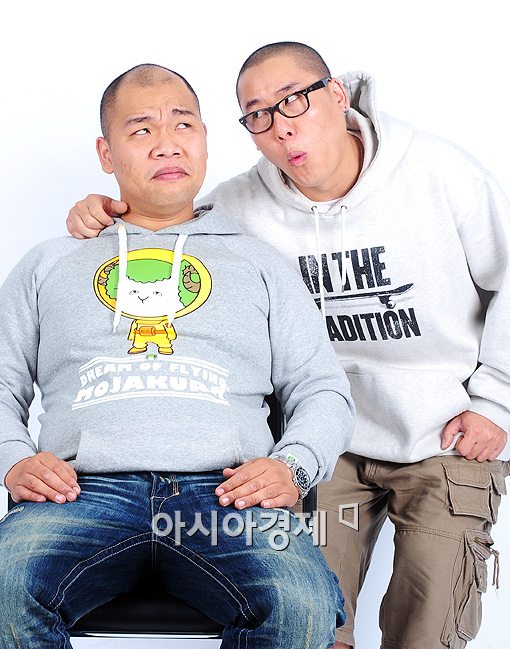 이 같은 시련을 넘어 이들은 '웃찾사'에서 유일하게 둘이 함께 코너 2개를 하는 개그맨이 됐다. 성민과 강현은 '비호왕자'를 시사풍자 장르로 키울 생각이다. 예전 큰 인기를 모았던 '네로 25시'처럼 말이다. 때문에 평소에는 안하던 신문·뉴스 삼매경에 빠져있다. "뉴스를 원래 잘 안 보는데 요즘은 6시부터 일어나서 뉴스도 보고 신문도 따로 신청했어요. 아직 적응은 안됐지만 곧 되겠죠. 뭐"(성민)성민과 강현은 함께 4년 넘게 함께 산 친구다. 때문에 서로의 속마음을 속속들이 다 알고 있다. '비호왕자'를 짜게 된 계기도 이들이 친구이기 때문이었다. "보통은 한 코너를 준비하려면 6~7개월 준비하거든요. 그런데 '비호왕자'는 둘이 함께 생각한지 2시간 만에 나왔어요. 그리고 PD님께 보여드렸더니 '다음 주에 와서 바로 하자'고 하시더라고요. 재미있었나봐요."(강현)"'나 왕자야'라는 멘트는 예전 영화 '할렐루야'에서 박중훈 선배님의 대사를 패러디한거거든요. 그런데 보신 분들은 전두환 전 대통령님을 성대모사 같다고 하더라고요. 자연스럽게 시사에 묻어가게 됐죠.(웃음)"(성민)강현과 성민은 '비호왕자' 외에도 '괜찮다'라는 코너를 선보이고 있다. "'괜찮다'는 준비한지 1년 반 정도 됐어요. '비호왕자'가 성인들을 위한 코미디라면 '괜찮다'는 어린아이들을 위한 코미디예요. 반응이 괜찮아서 기분 좋죠. 벌써부터 '난 괜찮다'라고 따라하는 아이들이 많아요."(성민)강현과 성민은 머리스타일까지 똑같다. "사실 강현은 머리에 퍼머를 하고 있었어요."(성민) "그런데 이 친구가 자고 있는 저에게 와서 면도기로 머리를 밀어버렸죠. 하지만 그때 밀려서 시청자들이 더 기억해주시는 것 같아요."(강현)이들은 인터뷰 말미까지 '웃찾사'를 살리겠다는 포부를 강조했다. "'웃찾사'도 내부적으로 많이 바뀌었어요. 예전에는 연차별로 출연료를 줬는데 이제는 무한경쟁이예요. 출연료도 기여도, 코너수 등으로 지급해요."(성민) "보도를 통해서도 나왔는데 박승대 대표님이 작가료를 후배 개그맨들에게 다 나눠주시더라고요. 저희도 받았는데 깜짝 놀랐죠. 박 대표님은 요즘 잠도 제대로 못 주무세요. 저번에 계단에 앉아서 잠깐 졸고 계시는 걸 봤는데 마음이 짠하더라고요."(강현)성민과 강현은 '비호왕자'와 '괜찮다'로 인해 쉬는 날이 없다. "3일은 대학로에 있고 3일은 방송국에 있죠. 마지막 하루는 저희 둘이 있고요.(웃음)"(성민) 이들의 이 같은 노력이 '웃찾사'를 살리는 원동력이 될 수 있을까.'괜찮다'의 강현(왼쪽)과 성민.