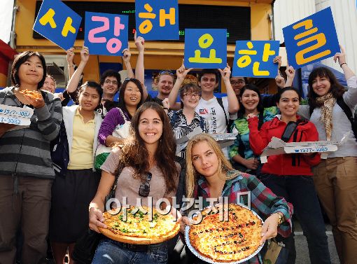 [아시아경제 이재문 기자] 도미노피자가 한글날을 이틀 앞두고 7일 서울 경희대학교 국제교육원 앞마당에서 한글을 배우는 세계 각국의 외국인 학생들을 격려하기 위한 도미노 피자파티를 열었다. 피자파티를 찾은 외국인 학생들이 '사랑해요, 한글!'을 외치고 있다.이재문 기자 moon@asiae.co.kr<ⓒ세계를 보는 창 경제를 보는 눈, 아시아경제(www.asiae.co.kr) 무단전재 배포금지>