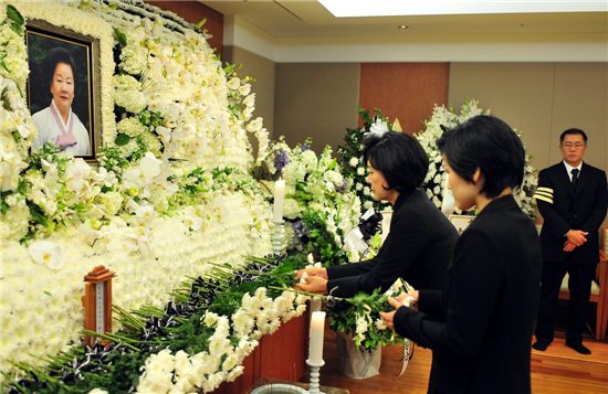 이건희 전 삼성그룹 회장 부인 홍라희 여사가 고(故) 이정화 여사 영정 앞에 헌화하고 있다.