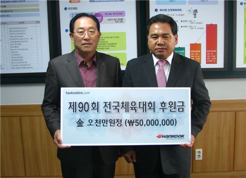 한국타이어가 제90회 전국체육대회를 공식 후원한다. (사진 왼쪽부터)정준수 시체육회 사무처장, 송권호 한국타이어 대전 공장장.