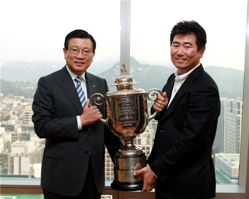 박삼구 한국프로골프협회 회장(사진 왼쪽)이 양용은 선수(사진 오른쪽)와 함께 US PGA 챔피언 트로피를 들고 기념촬영하고 있다.<br /> <br /> <br /> <br />