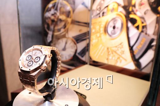 [아시아경제 윤동주 기자] 13일 서울 광장동 워커힐호텔에서 명품 시계전이 열렸다. 세계 3대 명품 시계 브랜드 중 하나인 시계전체를 금으로 장식한 '오데마르피게'의 로얄오군로 시계가 전시되고 있다.윤동주 기자 doso7@asiae.co.kr<ⓒ세계를 보는 창 경제를 보는 눈, 아시아경제(www.asiae.co.kr) 무단전재 배포금지>