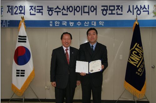 김양식 한국농수산대학 총장(왼쪽)이 22일 열린 제2회 전국 농수산아이디어 공모전 시상식에서 대상 수상자인 김웅태씨와 기념촬영을 하고 있다.