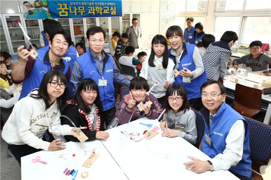삼성사회봉사단 이순동 사장(오른쪽)은 23일 안성시 명덕초등학교 꿈나무 과학교실 봉사활동에 참여해 삼성전자 임직원들과 함께 '에어로켓'을 만드는 프로보노 봉사활동을 펼쳤다.