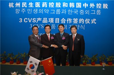 중외제약은 최근 중국 항주민생그룹과 1억 달러 규모의 수액제 수출계약을 체결하는 등 중국시장 공략에 본격 나서고 있다. 중외제약 이경하 부회장(왼쪽에서 두번 째)과 주 후지앙 항주민생그룹 회장(맨 오른쪽) <br /> <br />