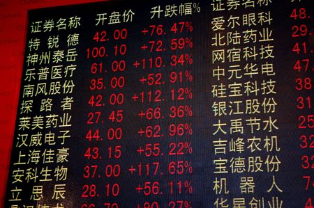 30일 개장한 중국 차스닥시장은 풍성한 기록들로 가득했다.28개 상장업체 가운데 200% 이상 오른 종목은 정보기술업체인 진야(金亞)가 유일하며 종가 35위안으로 장을 마쳐 209.73% 올랐다.장중 200% 이상 오른 종목이 5개였다는 점에서 막판 힘이 달린 모습을 보였다. 100~200% 오른 종목은 영화제작업체 화이슝디(華誼兄弟) 등 9개였다.장초반 상승세를 주도한 종목은 화이슝디였고 생명과학업체 안커(安科)ㆍ레저용품업체 탄루저(探路者)ㆍ의료기기업체인 러푸(樂普) 등도 두배 이상 오르며 열기를 더했다.모든 종목이 개장하자 마자 20% 이상 오르며 과열기미를 보여 거래가 여러 차례 중단됐다.오전장이 끝날 무렵 200% 이상 상승한 종목은 안커ㆍ탄루저ㆍ화이슝디ㆍ진야ㆍ이웨이(億緯) 등 5개 종목에 달했다.오후장이 들어서자 오전에 폭발적으로 오르기만 했던 추세가 갈라지기 시작했다. 대부분이 오름세를 보였지만 차익매물 실현 등으로 선저우타이외(神州泰嶽)가 떨어지기 시작했고 훙르(紅日)약업도 하락하는 모습을 보였다.가장 낮은 상승폭을 보인 종목은 난펑(南風)으로 75.84% 올랐다.김동환 베이징특파원 donkim@asiae.co.kr<ⓒ세계를 보는 창 경제를 보는 눈, 아시아경제(www.asiae.co.kr) 무단전재 배포금지>