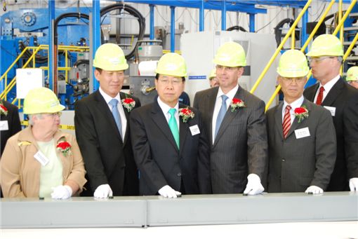 (왼쪽부터) 낸시 패런트 피츠버그 시장, 이운형 세아제강 회장, 정준양 포스코 회장, 존 서머 US스틸 회장, 구본우 샌프란시스코 총영사, 데이빗 로어 US스틸 상무가 2일(현지시간) 미국 캘리포니아주 피츠버그에 준공한 연산 27만t 규모의 고급 강관공장에서 기념촬영하고 있다.