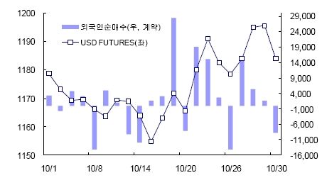 3일 국제금융센터에 따르면 외국인들은 환율이 1155.1원의 연저점을 기록한 후 반등함에 따라 대규모 순매수로 전환하며 환율 상승 가능성에 비중을 둔 모습을 보였다. 지난 10월15일 환율이 1155.0원을 저점으로 찍고 반등하면서 숏커버성 순매수세가 대거 유입됐기 때문이다. 환율은 월말까지 장중 1206.0원까지 올라 무려 50원 넘게 상승했다. 10월중 외국인들이 사들인 달러 선물은 4만1110계약(약 4억1000만달러)에 달했다. 이상원, 김용준 국제금융센터 연구위원은 "외국인은 1178.1원에서 1155.1원까지 하락하는 동안 2만8418계약 순매도하는 한편 1155.1원에서 1182.5원까지 오르는 동안 5만9584계약을 순매수해 환율 반등에 보다 민감하게 대응했다"고 설명했다. 주식시장에서는 주가 하락에 무게를 뒀다. 선물은 대규모 순매도로 전환, 옵션은 종전의 합성선물 매도 포지션을 일부 청산하는 양상을 보였다. 외국인의 10월말 선물옵션 미결제 포지션 분석 결과 외국인은 대규모 선물 매도 미결제 약정 및 종전의 합성 선물 매도 형태의 옵션 미결제 포지션을 통해 주가 하락시 이익이 발생하는 형태를 강화했다. 채권 파생상품은 국채선물 순매도 우위로 전환했다. 특히 10월 중 대부분 순매도에 집중하며 채권시장 약세를 견인했다. 외국인은 호주 금리인상 조치 이후 매도세를 지속했으며 지난 10월16일에는 사상최대규모의 순매도를 기록하는 등 금리 상승 가능성에 비중을 두는 모습을 나타냈다. 정선영 기자 sigumi@asiae.co.kr<ⓒ세계를 보는 창 경제를 보는 눈, 아시아경제(www.asiae.co.kr) 무단전재 배포금지>정선영 기자 sigumi@asiae.co.kr<ⓒ아시아 대표 석간 '아시아경제' (www.newsva.co.kr) 무단전재 배포금지>