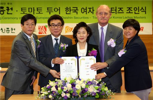 이어룡(왼쪽 세번째) 대신증권 회장이 지난달 12일 서울 영등포구 여의동 대신증권 본사에서 문재식(〃두번째) 토마토투어 회장과 함께 '2009 대신증권 - 토마토투어 한국여자 마스터즈 골프대회' 조인식을 갖고 기념사진을 찍고 있다.