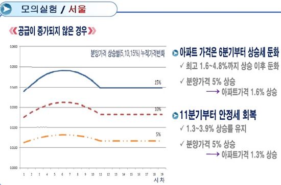 이에따라 서울에서 주택공급 증가분이 없을 경우 6분기째부터 분양가 상승세가 둔화돼 10분기 이후 정상을 찾아가는 것으로 조사됐다. 특히 상한제 폐지 후 최초 분양가가 15% 상승한 경우 최고 4.6%까지 분양가가 오르는 추세를 보이다 감소한 것으로 조사됐다.