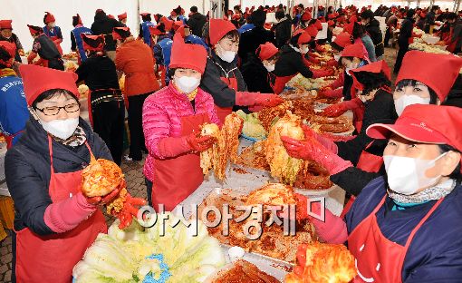 [아시아경제 이재문 기자] 김광원 한국마사회 회장과 박광태 광주시장을 비롯한 봉사자들이 20일 과천 서울경마공원에서 마사회 자매결연 시설에 전달하기 위한 김장 1만포기를 담그고 있다.이재문 기자 moon@asiae.co.kr<ⓒ세계를 보는 창 경제를 보는 눈, 아시아경제(www.asiae.co.kr) 무단전재 배포금지>