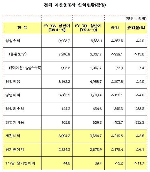 운용업계의 수익성은 크게 나빠졌다. 2009회계연도 상반기(4월1일~9월30일) 중 전체 자산운용사의 당기순이익은 2679억원으로 전년 동기 2854억원 대비 175억원(6.1%) 감소했다. 2008회계연도 하반기(1171억원) 대비로는 1508억원(128.8%) 늘었다.영업수익은 전년 동기 9029억원 대비 364억원(4.0%) 감소한 8665억원을 기록했다. 이는 펀드운용보수(6308억원)가 전년 동기(7247억원) 대비 939억원 감소(13.0%)했기 때문으로 풀이된다.반면 지난해 하반기 운용보수(4800억원) 대비로는 1507억원 증가(31.4%)해 영업실적이 점차 회복되고 있는 것으로 나타났다.영업비용은 전년 동기(5163억원) 대비 207억원 감소(4.0%)한 4956억원을 기록했으며 이는 해외투자펀드 운용규모 감소로 지급수수료가 전년 동기 대비 284억원 감소한데서 기인한다.회사별로는 올 상반기 당기순이익이 100억원 이상인 운용사는 총 9개사며 미래에셋(912억원), 미래에셋맵스(375억원), 신한BNP(222억원) 순으로 집계됐다. 총 68사중 21사(30.9%)가 적자를 기록했으며 적자 회사 중 14사는 지난해 이후 영업을 시작한 신설사였다.한편 재무건전성도 소폭 하락했다. 9월 말 현재 전체 자산운용회사의 평균 영업용순자본비율(NCR)은 456.6%로 지난해 9월말의 534.7%에 비해 78.1%포인트 낮아졌다. 이는 자산운용회사의 시장위험액(896억원)이 전년 동기(117억원) 대비 779억원 증가했기 때문이다. 적기시정조치 대상(NCR 150% 미만) 자산운용회사는 없었다.평균 부채비율은 전체 운용사 기준 21.5%로 지난해 말 14.3% 대비 7.2%포인트 높아졌다. 이는 펀드 직접판매에 따른 펀드 예수금이 지난해 9월 말 310억원에서 올 9월 말 2185억원으로 증가했기 때문이며 차입금은 같은 기간 130억원에서 60억원으로 감소했다.황상욱 기자 ooc@asiae.co.kr<ⓒ세계를 보는 창 경제를 보는 눈, 아시아경제(www.asiae.co.kr) 무단전재 배포금지>