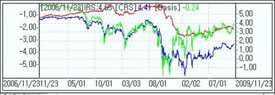 23일 오전 11시20분 현재 스왑시장에 따르면 IRS가 전구간에서 3~4bp씩 상승세다. IRS 1년물이 지난주말보다 3bp 오른 3.42%를 기록중이고, 3년물과 5년물이 전장대비 4bp 상승해 4.17%와 4.35%를 기록하고 있다.CRS도 1년구간을 제외하고 보합세다. CRS 1년물이 전장보다 2bp 내린 1.65%를 기록하고 있는 반면 3년물과 5년물이 보합을 기록하며 2.95%와 3.70%를 나타내고 있다.스왑베이시스는 이틀연속 벌어지고 있다. 1년물 기준으로는 전일 -171bp에서 -177bp를, 3년물 기준으로는 전장 -118bp에서 -122bp를, 5년물 기준으로는 전일 -61bp에서 -65bp를 나타내고 있다.외국계은행의 한 스왑딜러는 “IRS금리가 3bp 정도 상승세로 채권 현선물대비 상승폭이 적다. 커브도 수평이동 중”이라며 “본드-스왑은 1~2bp 와이드닝됐다”고 전했다. 그는 이어 “CRS는 비드 우위를 보이고 있지만 이렇다할 거래가 보이지 않고 있다”고 덧붙였다.김남현 기자 nhkim@asiae.co.kr<ⓒ세계를 보는 창 경제를 보는 눈, 아시아경제(www.asiae.co.kr) 무단전재 배포금지>