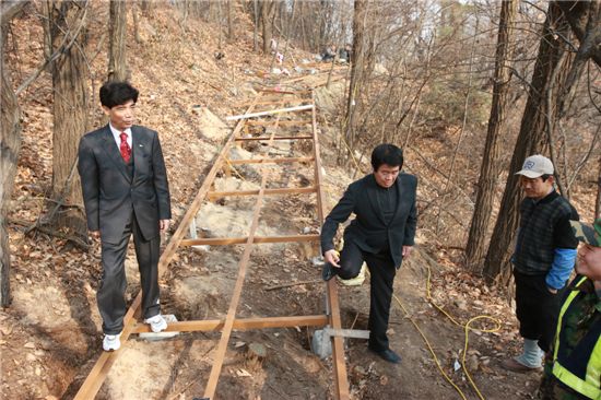 서찬교 성북구청장(왼쪽)이 북악산길 보행교 공사 현장을 찾아 점검하며 관계자들을 격려했다.