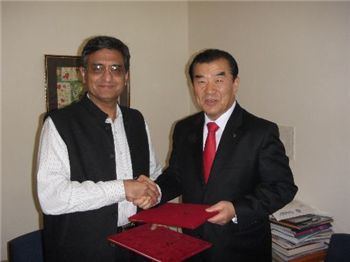 인도 델리대 디팍 펜탈(Deepak Pental)총장(좌)과, 고려대 이기수 총장이 23일 델리대에서 학술교류협정을 채결했다.<br />