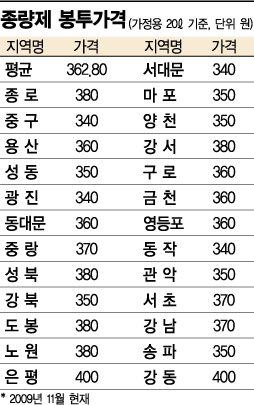 [아시아경제 박현준 기자] "같은 물건인데도 가격차는 천차만별". 서울시 각구에서 팔고 있는 쓰레기 종량제 봉투값을 두고 나오는 지적이다. 서울시 25개 자치구의 쓰레기 종량제 봉투 판매가격은 구별로 차이가 적지 않다. 25일 서울시에 따르면 11월 말 현재 가정용 20리터짜리 쓰레기 종량제 봉투값은 중ㆍ광진ㆍ서대문ㆍ동작구는 340원인 반면, 종로ㆍ도봉구는 380원, 중랑ㆍ서초ㆍ강남구는 370원, 은평ㆍ강동구는 400원 등으로 나타났다. 양창호 서울시의원(영등포구3)이 지난 7월 25개 자치구 쓰레기 종량제봉투 판매가격을 분석한 결과, 같은 쓰레기봉투라도 자치구마다 최대 46.7%의 가격차가 있는 것으로 나타났다. 이러니 시민들은 어리둥절할 수밖에 없다. 서울 서대문구 신촌동에 거주하는 김 모씨(27세)는 "크기가 같은 물건인데도 자치구마다 값이 다른 것은 형평에 어긋난다"고 지적했다. 서울의 각 자치구에 종량제 봉투를 납품하는 20여개 회사들은 모두 같은 값에 공급하고 있다. 조달청이 '다수공급자물품'으로 업체와 계약을 먼저 체결하면 자치구가 쓰레기 종량제 봉투를 사오는 방식이다. 20리터 기준으로 약 47원이 공급가. 그러나 구의회 조례를 거치면 값은 달라진다. 구입 원가에다 수거 수수료, 처리비 및 판매이윤을 더해 최종 소매가격이 결정된다. 여유가 있는 자치구는 예산을 지원해 소매가를 낮추는 반면, 그렇지 못한 자치구는 현실대로 값을 매긴다.일례로 '부자' 구인 강남구는 ▲주택지역의 수집ㆍ운반ㆍ처리수수료 ▲ 소형음식점 등의 처리수수료는 구 예산으로 부담한다. 이러니 1물1가의 원칙은 여지 없이 깨질 수밖에 없다. 가격산정 과정도 의문이다.양 의원은 "종량제 봉투 가격에는 쓰레기 수거업체 수수료가 반영된다"면서 "문제는 수거업체가 수의계약으로 지정되는데다 수수료도 자치구 마다 다르는 점"이라고 지적했다. 환경부에 따르면 전국 168개의 지자체에서 특정 청소업체와 길게는 40년, 평균 12년 이상 장기간 수의계약을 하고 있는 것으로 나타났다. 소매점 이윤도 제각각이다. 도봉구는 가정용 20리터짜리 쓰레기 종량제 봉투를 소매점에 352원에 공급한다. 소매점은 이를 380원에 팔아 봉투 한 장마다 28원의 이윤을 남긴다. 반면, 송파구는 332원을 받고 소매점에 넘기고, 소매점은 350원에 팔아 18원의 이윤을 남긴다. 봉투 한 장에 소매점 이윤이 구마다 10원씩 차이난다. 이에 대해 서울시와 자치구,청소업자들은 높은 지대가 많은 자치구는 사람이 일일이 쓰레기를 거둬들여야 하는 반면, 차량으로 수거할 수 있는 자치구가 있는 등 청소여건이 달라 수수료를 일률로 정하기 어렵다거나 몇년간 올리지 않는 자치구도 있고 올렸다가 내린 자치구도 있다고 설명한다. 그러나 그런 설명은 저소득층,부자동네가 아닌 자치구에 사는 주민들은 차별을 감내하라는 말과 크게 틀리지 않다. 정부가 민간 청소업자의 영업구역을 시ㆍ군ㆍ구에서 광역자치단체 단위로 바꾸는 폐기물관리법 시행령 개정안을 마련,내년부터 시행하려는 계획은 그나마 다행이다. 정부안과 반대로 영업범위를 사업허가를 받은 특정 자치구로 제한하는 법안을국회가 발의한 게 가장 큰 걸림돌이다.박현준 기자 hjunpark@asiae.co.kr<ⓒ세계를 보는 창 경제를 보는 눈, 아시아경제(www.asiae.co.kr) 무단전재 배포금지>