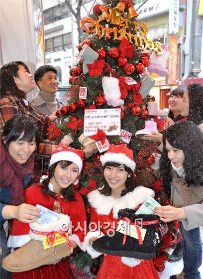 [아시아경제 김현정 기자] 슈즈 쇼핑센터 ABC마트가 크리스마스를 한 달 앞둔 25일 '미녀 산타와 함께하는 ABC마트 어린이 병동 후원 사랑의 모금 행사'를 진행한다.이번 행사를 위해 ABC마트에서 직접 제작한 대형 크리스마스 트리는 명동 매장 앞 중앙 거리에 설치됐으며, 올 겨울 ABC 마트의 대표 상품인 양털 부츠를 장식으로 매달아 이색적인 크리스마스 볼거리를 선사한다. 특히 이날 모금 행사에는 양털 부츠를 신은 미녀 산타들이 직접 양털 부츠 모금함을 들고 나서 거리에 나서 지나가는 시민들의 눈길을 사로잡는다. 이번 행사에서 모인 성금 전액은 ABC마트의 2009년 12월 총 매출의 1%를 더해 연세의료원 어린이 병동에 전달할 계획이며, 전달된 금액은 난치병을 앓고 있는 어린이 환자를 위해 쓰일 예정이다.김현정 기자 alphag@asiae.co.kr<ⓒ세계를 보는 창 경제를 보는 눈, 아시아경제(www.asiae.co.kr) 무단전재 배포금지>