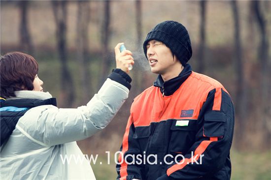 Despite the chilly November breeze, a golf course in the Gangwon province shines with the greenness of its grass. Actor Ji Hyun-woo, who has kicked off his shoes, rolls around on the green. The sun beats down on him but there is steam seen coming from every breath he takes to speak his lines. Ondal the fool and Princess Pyung Kang, who have been reincarnated in modern day Korea, have laid their youth, pureness and life onto this golf course. Thanks to that, the field is not just simply a background scenery but rather a crucial key to the TV series "Invincible Lee Pyung Kang." On this certain day, Ji lies underneath a sprinkler squirting out water and soon becomes soaked from it entirely. His stylist, holding a portable heater in her hands, looks on at Ji with a concerned look on her face but the relentless director Lee Jung-sub is not satisfied and shouts out, "Ondal's face is too dry. Spray more water on him!" Unlike Ji, actor Kim Heung-soo dressed neatly in golf wear, enjoys his free time by practicing his putts. He becomes even more confident as the time nears for him to shoot his kissing scene and Ji, who was drying his wet socks and actress Nam Sang-mi, who was looking at her script to rehearse her lines, both run toward Kim to root him on for the shoot. But it is not an easy task holding a huge parasol in one hand to keep out the water from the sprinklers and trying to kiss Cha Ye-ryun who is constantly nagging Kim. Everyone's lips start turning blue -- from the crew who are soaked from head to toe from manually controlling the direction of the sprinkler to the director who had been closely monitoring the screen to Kim whose arm is starting to shake from holding the heavy parasol with one arm for so long. But this will barely hinder their efforts. A passerby exclaims, "On such a cold day! You guys are young!" As long as their passion remains as young as their youth, they are invincible from the cold winter days.Reporter: Yoon Hee-Seong nine@10asia.co.krPhotographer: Lee Jin-hyuk eleven@10asia.co.krEditor: Linda Kim lindakim@asiae.co.kr, Jang Kyung-Jin three@10asia.co.kr<ⓒ10Asia All rights reserved>