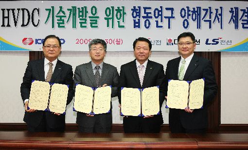 [아시아경제 이경호 기자] 한국전력은 30일 삼성동 본사에서 LS산전, 대한전선, LS전선과 고압직류송전(HVDC) 국산화기술개발 협동연구를 위한 양해각서를 체결하고 HVDC핵심기술 개발과 사업화에 공동노력키로 했다. 이경호 기자 gungho@asiae.co.kr<ⓒ세계를 보는 창 경제를 보는 눈, 아시아경제(www.asiae.co.kr) 무단전재 배포금지>