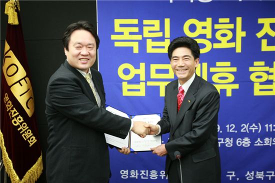 서찬교 성북구청장(오른쪽)과 조희문 영화진흥위원장이 '한국 다양성(예술, 독립) 영화 배급 상영 활성화와 한국영화 발전을 위한 업무제휴 협약'을 맺은 뒤 악수를 나누고 있다.<br />