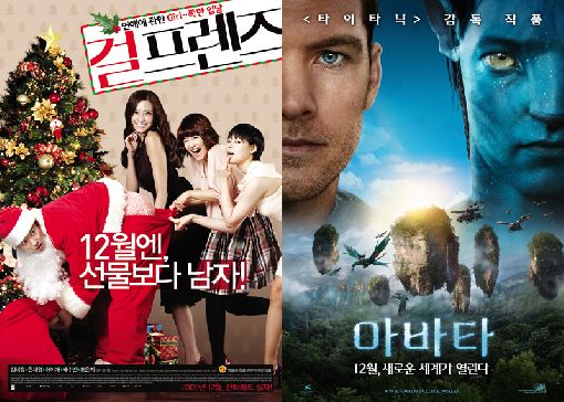 #한 남자를 공유하고픈 세 여자 '걸프렌즈' VS 제임스 카메론 감독의 14년 결실 '아바타' 12월 셋째주는 세 여자가 한 남자를 공유하는 영화 '걸프렌즈'와 새로운 생명체에 대한 상상력을 기반으로 한 '아바타'가 전면 대격돌 한다. ‘다른 여자에게서 내 남자의 향기가 난다면?!’ 영화 '걸프렌즈'는 한 남자를 공유 하고픈 여자들 사이에 공감대를 형성시키는 독특한 이야기.이에 반해 할리우드 거장 제임스 카메론 감독이 기획단계부터 완성까지 14년의 시간이 걸린 영화 '아바타'는 가상의 행성 판도라를 찾아가 인간들이 원주민과 인간의 DNA를 합쳐서 새로운 생명체인 아바타를 만들면서 벌어지는 SF 블록버스터이다.