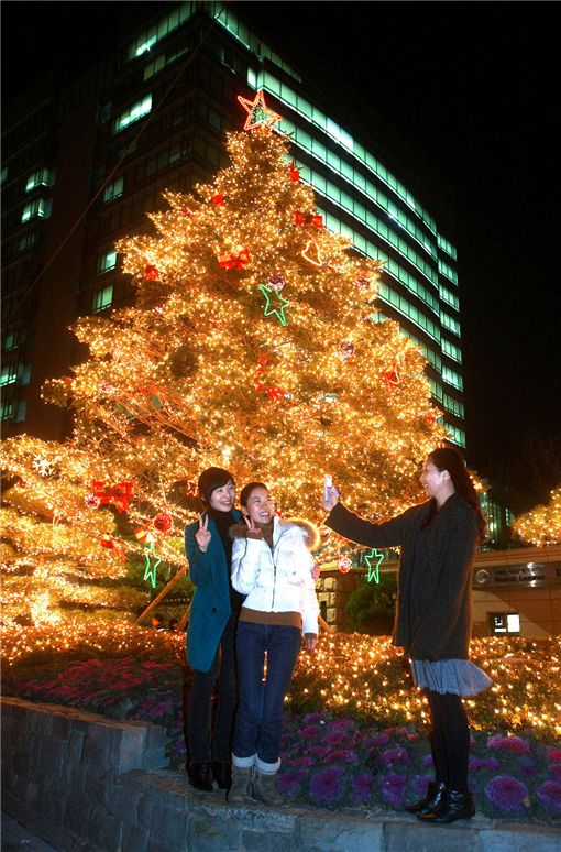 현대중공업 여사원들이 회사 정문 앞에 설치된 트리를 감상하며 즐거워하고 있다.