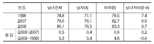 전백근 통계청 인구동향과장은 이처럼 출생아의 기대수명이 늘어난데 대해 “전년 대비론 60~70대 고연령의 사망률이 4.6% 감소했으며, 최근 10년 사이엔 남자의 경우 45~64세 장년층과 65세 이상 고연령층의 사망 감소가, 또 여자는 고연령층의 사망 감소가 크게 기여했다”고 분석했다.지난해 출생한 남자의 기대수명은 76.5세, 여자는 83.3세로 여자가 남자보다 6.7년 길었다. 10년 전인 1998년엔 남자가 71.1세, 여자가 78.5세로 격차가 7.4년이었다. 남녀 간 기대수명 차이는 지난 1985년 8.4년을 정점으로 점차 감소 추세에 있으나, 2007년의 6.6년보다는 소폭 증가한 것으로 나타났다.또 지난해 현재 45세 남자가 앞으로 더 살 것으로 예상되는 연수인 기대여명은 33.3년이며 45세 여자는 39.6년으로 조사됐다. 30세 남녀의 기대여명은 각각 47.5년과 54.1년이었고, 65세 남녀는 각각 16.6년과 21.0년인 것으로 추정됐다.성.연령별 기대여명(2008) (자료: 통계청)