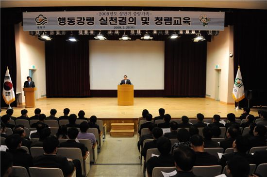 문병권 중랑구청장이 직원들을 대상으로 청렴 강의를 하고 있다.