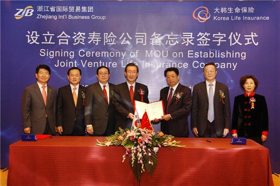 저장성무역그룹과 MOU… 2011년말 영업 할 듯[아시아경제 김양규 기자]대한생명이 중국 항저우시에 합작사 설립을 통해 중국에 진출한다.대한생명은 중국 항저우시 하얏트호텔에서 저장성국제무역그룹과 합작 생명보험사 설립을 위한 양해각서(MOU)를 체결했다고 11일 밝혔다. 이 자리에는 신은철 대한생명 부회장과 왕찬거 저장성국제무역그룹 회장 등 양사 임직원이 참석했다.합작사 자본금은 5억위안(약 900억 원)이며 양측이 절반씩 투자키로 했다. 본사는 항저우에 둘 예정이다.대한생명은 조만간 합작사 설립 신청서를 제출한 뒤 예비인가, 본인가, 자본금 납입 등의 과정을 거쳐 오는 2011년 말쯤 영업이 개시될 것으로 예상하고 있다.저장성국제무역그룹은 저장성 정부 직속 국유기업이다. 총 자산은 2조 7000억원으로, 국유자산관리ㆍ무역서비스 등이 중점 사업영역이지만 금융업에도 진출해 있다.저장성은 인구가 5000만명이 넘고 합작법인 본사가 위치할 항저우시는 지난해 1인당 국내총생산(GDP)가 1만달러에 달하는데다 중산층이 두터워 보험 영업에 좋은 시장으로 평가받고 있다.한편 대한생명은 지난 2003년 베이징에 사무소를 열어 중국 시장 진출을 준비해왔으며 국내 보험사로서는 삼성생명ㆍ현대해상ㆍ삼성화재ㆍLIG손보에 이어 다섯 번째로 중국 시장에 진입하게 됐다. 김양규 기자 kyk74@asiae.co.kr<ⓒ세계를 보는 창 경제를 보는 눈, 아시아경제(www.asiae.co.kr) 무단전재 배포금지>