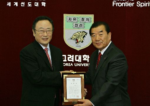 [아시아경제 손현진 기자]사공일 한국무역협회 회장(왼쪽)이 14일 고려대 이기수 총장으로부터 감사패를 받고 기념촬영을 하고 있다. 사공 회장은 일평생 수집한 경제·무역학 관련 서적 2100여 권을 고려대학교에 기증했다.손현진 기자 everwhite@asiae.co.kr<ⓒ세계를 보는 창 경제를 보는 눈, 아시아경제(www.asiae.co.kr) 무단전재 배포금지>