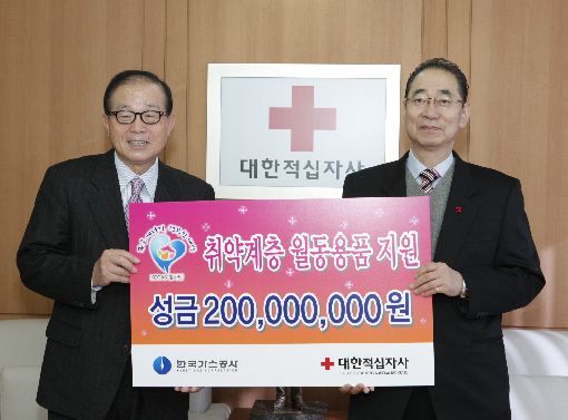 주강수 사장(오른쪽)이 유종하 대한적십자사 총재에게 2억원의 성금을 전달하고 있다