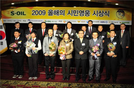 [아시아경제 김혜원 기자] S-OIL은 17일 서울 여의도 63빌딩에서 아흐메드 에이 수베이 CEO(뒷줄 오른쪽 4번째)와 김득린 한국사회복지협의회장(뒷줄 왼쪽 3번째)이 참석한 가운데 '올해의 시민영웅' 시상식을 개최하고 의로운 행동으로 이웃을 위험에서 구해낸 '시민영웅' 13명에게 상패와 위로금 1억4000만원을 전달했다.김혜원 기자 kimhye@asiae.co.kr<ⓒ세계를 보는 창 경제를 보는 눈, 아시아경제(www.asiae.co.kr) 무단전재 배포금지>