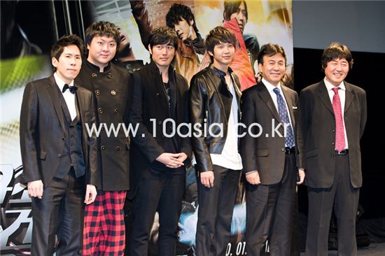 Q: There were a lot of action scenes in the highlight videos. Were there any injuries? Jung: I think I was too ambitious. I broke my nose in the last fight scene because we didn’t quite click with one another. I wanted to get a nose job but I couldn’t because the producers told me they were running low on money and I was a newbie so I couldn’t make demands. (laugh) Q: When “Attack The Gas Station” opened, the country was faced with an economic crisis and we are also dealing with a bad economy these days. How do you want to approach the audience with this movie? Kim: I always want to make a fun movie. Before the shooting, I talked a lot with young people about how they are living and how they want to live in the future. I think a lot of that came out in the film. Park: I politely refused [to do the movie] in the beginning. I said that I wanted to retire and live a quiet life. But then I kept hearing about the movie and felt like it was something I had to do. (laugh) That’s how I started but I was afraid at first. I felt like I had forgotten everything about doing comedy and I was worried if I could make people laugh. But when I heard the director say ‘okay’ after I did my first scene on the first day of shooting, I was able to regain my confidence. I will try to pay back the Korean people who regard me as an actor that they still want to see in movies.Actor Moon Won-ju [Chae Ki-won/10Asia]