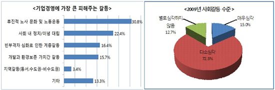 가장 심각한 갈등이 무엇인지를 묻는 질문엔 63.7%가 '정치.이념 대립'을 꼽았고 24.9%는 '빈부격차 심화', 11.3%는 '노사대립 심화'라고 응답했다.사회 갈등으로 인한 피해에 대해서는 21.3%가 '매출액 감소'를 들었으며 19.7%는 '대외 신인도와 기업 이미지 추락'을 지적했다. '설비 투자 및 신규 사업 진출 포기'는 12.3%, '신규 채용 위축'은 10.3%였다.