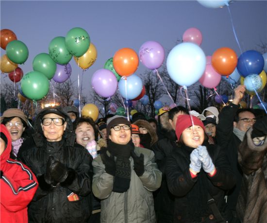 2009년 1월 1일 해맞이 행사에 참여한 성북구민들이 자신들의 새해 소망을 적어 넣은 풍선을 들고 일출 순간을 기다리고 있다.<br /> <br />
