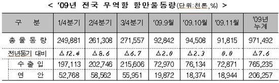 [아시아경제 황준호 기자] 새해 항만물동량에 청신호가 켜졌다. 지난 10월에 이어 지난달에도 항만 물동량 회복세가 이어져 지난해 같은 기간 수준으로 올라섰기 때문이다. 27일 국토해양부에 따르면 지난달 전국 무역항에서 처리한 항만물동량은 총 9181만5000톤으로 지난해 같은달 9185만7000톤과 동일한 수준인 것으로 집계됐다. 세계적인 경기침체로 지난해 12월 항만물동량은 2007년 같은달 대비 12% 축소됐었다. 이후 항만물동량은 지난 8월 △6.9% 수준까지 올랐다. 이어 지난달에는 지난해 같은 달 수준의 물동량(△0.05%, 4만2000톤)을 처리한 것으로 조사됐다. 품목별로는 화공품과 철재가 지난해 같은 달 대비 각각 13.7%, 6.6%로 증가했다. 하지만 모래와 자동차는 각각 15.5%, 13.3%로 감소했다. 항만별로는 부산항과 평택당진항이 지난해 같은 기간 대비 각각 19.7%, 16.7%로 증가했다. 인천항은 2.8%로 소폭 올랐다. 반면 울산항, 광양항, 포항항 등은 각각 6.9%, 2.1%, 17.9% 등의 감소세를 나타냈다. 또한 지난달 컨테이너 처리실적은 148만2000TEU로 지난해 같은 기간 대비 10.9% 가량 늘어났다. 수입화물 컨테이너(46만4000TEU)는 지난해 같은 기간 대비 8.6% 증가했으며 수출화물 컨테이너는 47만1000TEU를 기록 11.2% 많아졌다. 이어 환적화물 컨테이너는 48만8000TEU로 11.6% 확대됐다. 전국 컨테이너 처리량의 약 74%를 차지하는 부산항은 지난달 107만8000TEU를 처리해 올해 들어 처음으로 지난해 같은 기간 대비 증가세를 나타냈다. 이어 광양항의 처리량은 지난해 같은달 대비 26.2%가량 커졌다.