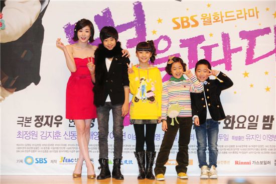 From left, actress Choi Jung-won and child actor Park Ji-bin, Kim Yuri, Joo Ji-won and Chun Bo-geun pose during a press conference for SBS TV series "Wish Upon a Star" held at the SBS headquarters in Seoul, South Korea on December 28, 2009. [SBS]