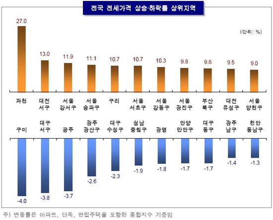 [아시아경제 황준호 기자] 집값과 더불어 전세가격도 경기도 과천이 지난해 전국에서 가장 높은 상승률을 나타낸 것으로 집계됐다. 서울 강북에서는 광진구가, 강남에서는 강서구가 가장 많이 오른 것으로 조사됐다. KB국민은행연구소에 따르면 지난해 전국의 주택전세가격은 신규 물량 부족에 따른 수급 불균형 지속으로 2008년말 대비 3.4% 상승했으나 장기평균(6.1%)을 크게 하회했다. 서울(6.0%)은 지난해 급증했던 입주물량이 소진되며 동남권역을 중심으로 높은 상승률을 나타냈다. 부산(5.3%)과 대전(8.3%)은 수급불균형에 따른 전세난이 지속되며 가격이 크게 올랐다. 수도권, 5개 광역시, 기타지방은 각각 4.2%, 2.9%, 1.9% 상승하며 수도권이 상대적인 강세를 보였다. 서울 강북지역(4.0%)에서는 광진구(9.8%)가 소형아파트를 중심으로 수급불균형이 지속되며 가격이 크게 상승했다. 노원구(5.8%)는 상계 뉴타운 이주, 신혼부부·학군 수요 증가로 상승곡선을 그렸다. 강남지역(7.9%)에서는 강서구(11.9%)가 화곡3주구 주택재건축 정비사업에 따른 이주수요 증가·9호선 개통에 따른 수요 증가로 높은 상승세를 기록했다. 송파구(11.1%)는 급증했던 입주물량이 소진되며 연중 물량 부족현상이 지속된 가운데 학군 수요, 위례신도시 대기자 수요 등이 크게 증가했다. 서초구(10.7%)와 강동구(10.3%)는 대단지 물량 소진 이후 공급물량 부족에 따른 수급불균형으로 10%를 상회하는 높은 상승률을 지켰다. 과천(27.0%)은 지난해 '래미안 슈르' 대단지 입주로 하락했던 전셋값이 상승하며 전국에서 가격이 가장 상승한 것으로 집계됐다. 대전 서구(13.0%)도 최근 신규 물량 부족에 따른 물량 품귀현상으로 임대인 우위의 시장이 형성되며 가격이 크게 올랐다. 구리(10.7%)는 가운지구 입주물량 소진 이후 물량 부족현상이 지속됐으며 부산 북구(9.6%)는 경기침체에 따른 신규 물량 급감으로 물량이 부족한 가운데 재건축 이주수요가 크게 증가했다. 주택유형별로는 아파트, 단독, 연립주택이 각각 4.5%, 1.0%, 2.5% 상승하며 2008년 0.8% 상승에 그쳤던 아파트가 강세를 보였다. 서울 강남지역에서는 아파트가 10.4% 상승하며 지난해(△3.6%)에 비해 크게 상승했고 단독주택과 연립주택도 각각 3.4%, 4.9% 상승한 것으로 조사됐다. 전국의 주택규모별 전세가격은 대형, 중형, 소형이 각각 2.6%, 4.3.%, 3.6% 상승하며 중형이 상대적인 강세를 나타냈다. 이는 2008년 말부터 올 연초까지 중대형을 중심으로 크게 하락했던 가격이 회복되는 과정에서 실수요자가 중형에 몰린 것으로 분석된다.