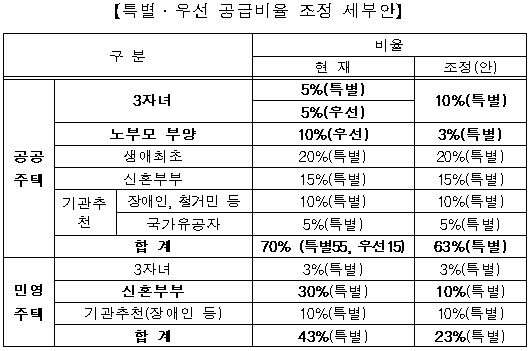 [아시아경제 황준호 기자] 오는 2월부터 민영주택의 일반공급비중이 20% 늘어난다. 공공주택은 우선공급분이 특별공급으로 일원화되면서 일반공급물량이 7% 확대된다. 위례신도시와 보금자리주택 2차지구 청약시 청약통장을 통해 새집을 얻을 수 있는 기회가 많아지는 것으로 분석된다.또한 철거민과 장애인을 제외한 모든 특별공급 물량은 신혼부부·생애최초 특별공급과 마찬가지로 입주자 저축통장을 사용해야 한다.국토해양부는 이같은 내용을 포함한 '주택공급에 관한 규칙' 개정안을 입법예고하고 오는 26일까지 의견을 받는다고 밝혔다. 개정안은 우선공급을 특별공급으로 흡수하고 특별공급 비율을 축소 조정했다. 공공주택의 경우 특별·우선공급 비중이 70%에서 특별공급 63%로 조정된다. 이는 노부모 부양자의 주택수요가 현행 10%에서 3%로 줄어들기 때문이다. 민영주택은 특별공급 비중이 43%에서 23%로 조정된다. 이는 신혼부부 물량이 30%에서 10%로 하향조정됨에 따른 변화(공공주택은 15% 유지)다. 또한 생애최초 특별공급 소득요건을 현행 전년도 도시근로자 소득의 80%에서 100%로 상향 조정한다. 2008년도 도시근로자 월평균소득은 3인가구 이하 389만4709원, 4인가구 427만6642원, 5인가구 438만4491원 등이다. 특별공급 대상 중 신혼부부·생애최초 특별공급에만 입주자 저축을 사용하던 것을 모든 특별공급으로 확대했다. 다만 철거민과 장애인은 지금처럼 입주자저축에 가입하지 않고도 특별공급 신청이 가능하다. 공공주택을 특별공급 받기 위해서는 입주자저축을 6개월 이상 납입해야 하고 민영주택은 6개월이상 가입 및 지역예치 최소금액 이상을 납입해야 한다. 최소금액은 서울·부산은 300만원, 광역시은 250만원, 기타지역은 200만원 이상이다. 여기에 분양주택의 신혼부부 특별공급 면적을 60㎡ 이하 → 85㎡ 이하로 확대한다. 또 임신중인 부부도 신혼부부 특별공급(국민임대인 경우 우선공급) 대상에 포함하는 방안이 마련된다. 여기에 입양으로 신혼부부 특별공급 받은 자가 분양후 파양하는 사례가 발생해 입양으로 특별공급 받은 자는 입주시까지 입양을 유지토록 규정했다. 황준호 기자 rephwang@asiae.co.kr<ⓒ세계를 보는 창 경제를 보는 눈, 아시아경제(www.asiae.co.kr) 무단전재 배포금지>
