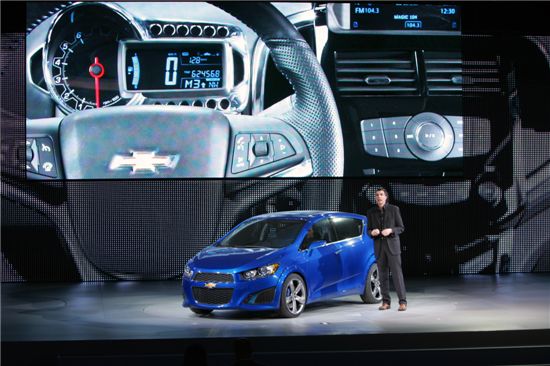 GM의 마이클 심코 외관 디자인 총괄 임원이 10일(현지 시간) 열린 2010 북미 국제 오토쇼 리허설에서 GM대우가 주도적으로 디자인 한 GM의 차세대 글로벌 소형 콘셉트카 '시보레 아메오 RS'쇼카를 소개하고 있다. GM이 이번 모터쇼를 통해 세계 최초로 선보이는 '시보레 아베오 RS'쇼카는 보라카이 블루의 외관 색상과 커버 없이 노출된 입체적 느낌의 모터 사이클 형상 헤드 램프 등 스포티하고 혁신적 스타일이 특징이며, 11일 첫 공개된다. <br />