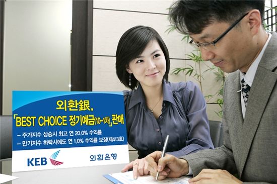 [아시아경제 박성호 기자]외환은행은 주가지수 변동률 조건에 따라 각각 최고 연 7.0% 와 20.0%의 시장금리 이상의 수익 달성이 가능한 'BEST CHOICE 정기예금(10-1차)'을 11일부터 20일까지 판매한다고 밝혔다.최저 가입금액은 100만원 이상으로 가입대상은 제한이 없고 예금기간은 1년, 생계형저축 및 세금우대저축으로 가입할 수 있다.